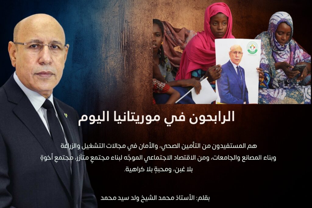 الرابحون اليوم في موريتانيا؛ هم المستفيدون من التأمين الصحي، والأمان في مجالاتِ التشغيلِ والزراعة وبناءِ المصانعِ والجامعاتِ، ومن الاقتصادِ الاجتماعي الموجّه لبناء مجتمعٍ متآزرٍ، مُجتمعِ أخوةٍ بلا غبن، ومحبةٍ بلا كراهية.